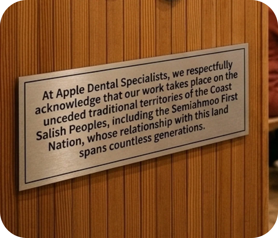 At Apple Dental Specialists, we respectfully acknowledge that our clinic operates on the unceded traditional territories of the Coast Salish Peoples, including the Semiahmoo First Nation, whose relationship with this land spans countless generations.